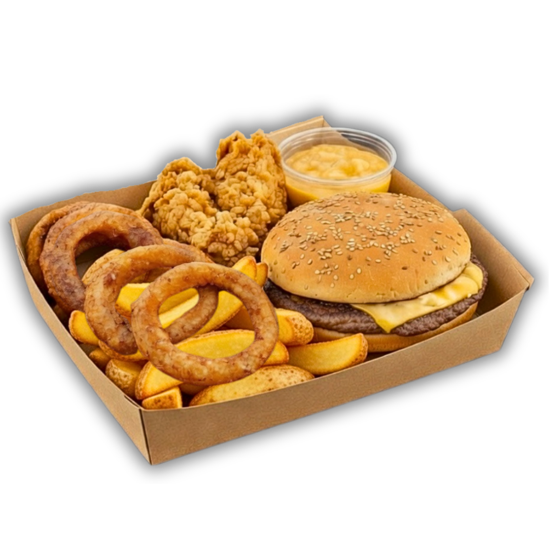 1x Chesseburger, 4x Onions Rings, 2x Tenders, 1x Portion de frites, et 1x Sauce